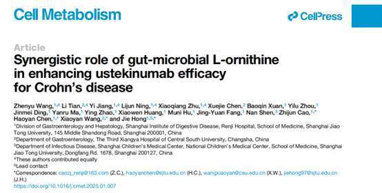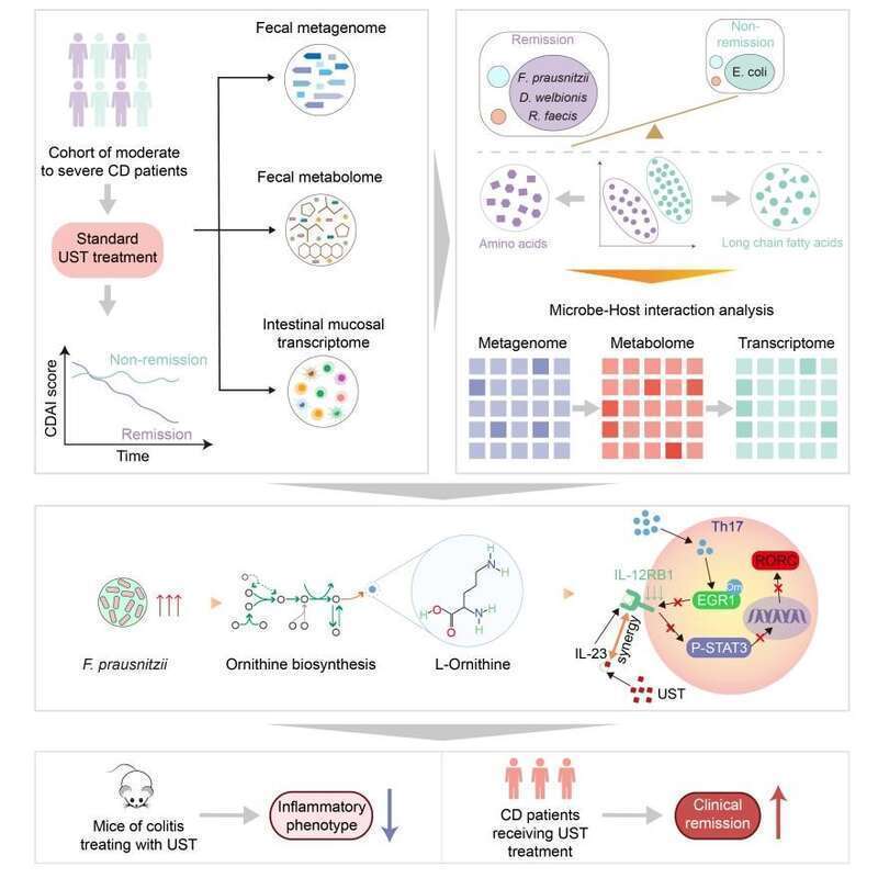 中国青年报客户端讯(中青报·中青网记者 王烨捷)近日,上海交通大学医学院附属仁济医院消化科洪洁团队于国际著名期刊《细胞代谢》发表题为肠道微生物L-鸟氨酸在增强优特克单抗治疗克罗恩病疗效中的协同作用”的研究论文。该研究通过整合克罗恩病(CD)患者接受乌司奴单抗(ustekinumab)治疗的多组学数据,结合体内外实验验证,首次阐明以普拉梭菌(Faecalibacterium prausnitzii)为代表的肠道微生物驱动的L-鸟氨酸(L-ornithine)生物合成可显著增强乌司奴单抗的临床疗效。此项发现不仅为克罗恩病的治疗提供了新的生物标志物,也开辟了乌司奴单抗联合用药治疗的新方向。